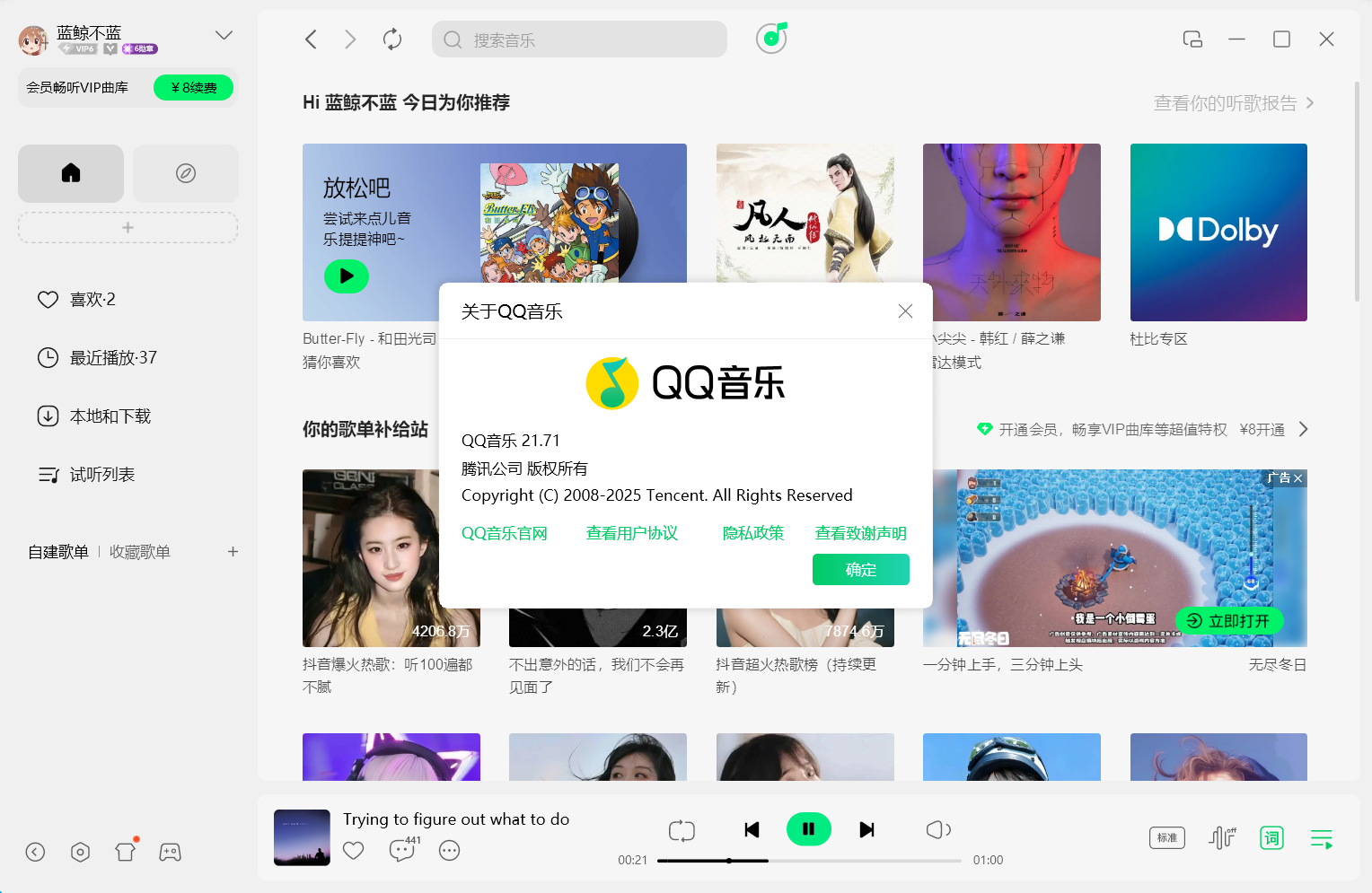QQ音乐拥有最大正版音乐曲库,免费畅享5.1声道品质音效、耳纹音效,Super Sound智能音效,黑胶音效等,支持声学适配。QQ音乐电脑版,听歌偏好智能推荐,支持听歌识曲,QQ等级加速,首创歌词翻译。