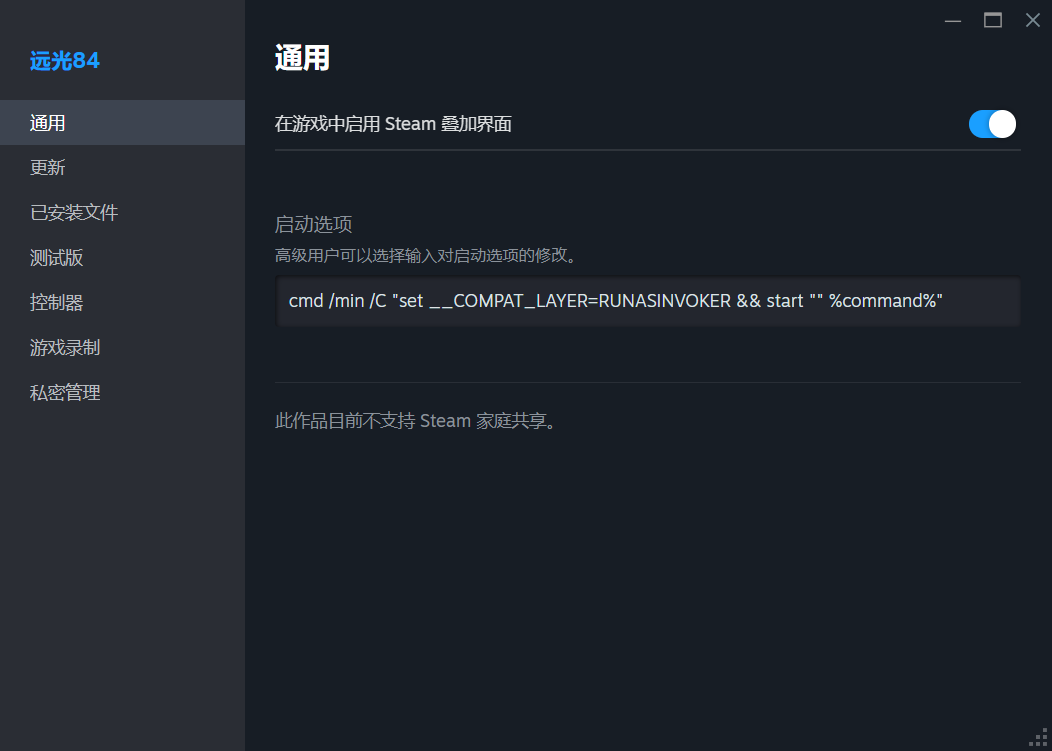 2.在启动选项中填入:cmd /min /C "set __COMPAT_LAYER=RUNASINVOKER && start "" %command%"